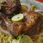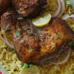 Chicken ko saffron rice,onion rings,dahi ka raita aur chutney ka saath serve karein.