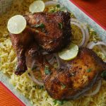 Serve chicken with saffron rice,onion rings,yogurt raita & chutney.