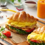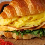 -Toasted croissant par tayyar sauce,salad patta,tamatar slices,cheddar cheese slices,mortadella slices aur scrambled egg rakh kar doosra croissant upar se rakh dein (makes 2).