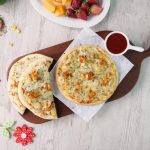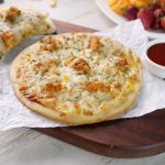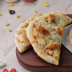 -Pita/shawarma bread per pizza sauce dal ker pheela lein,cooked chicken topping,shimla mirch,corn kernels,pyaz,cheddar cheese,mozzarella cheese & dried oregano dal dein.