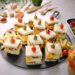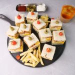 -Four bread slices per mayonnaise dal dein,ek slice per kheera aur tamatar dal dein aur dosray slice per cooked anda dal ker namak aur kali mirch crushed chirak dein.