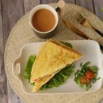 Add onion,tomato,green chilli,fresh coriander and cheese slice and flip the other bread slice over it,press gently & cook on low flame until cheese melts.