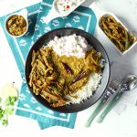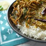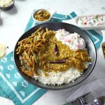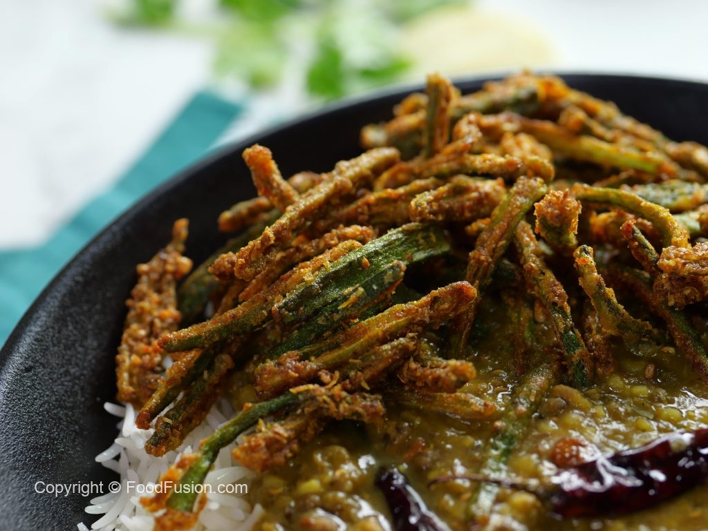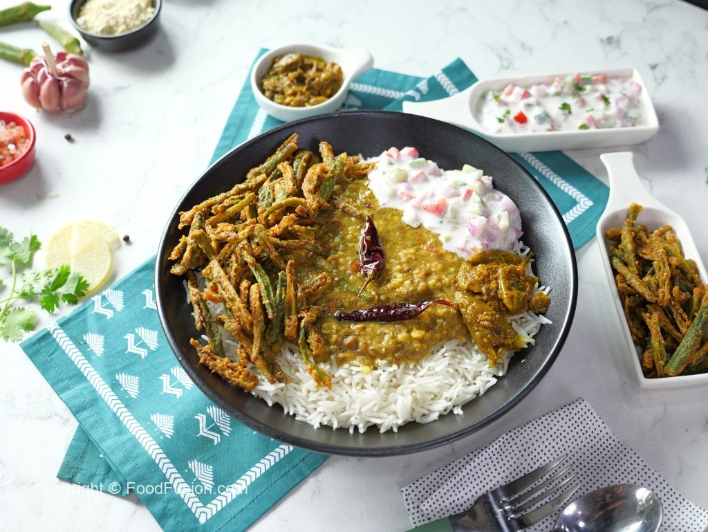 -In a serving bowl,add boiled rice,prepared daal,crispy bhindi,kachumar raita,achar & serve!