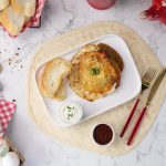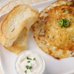 -Serving plate mein fried potatoes,fried cheese egg,hara dhania & hari mirch dal dein,French bread,sour cream & chilli garlic sauce ka saath serve karein!