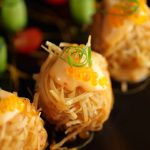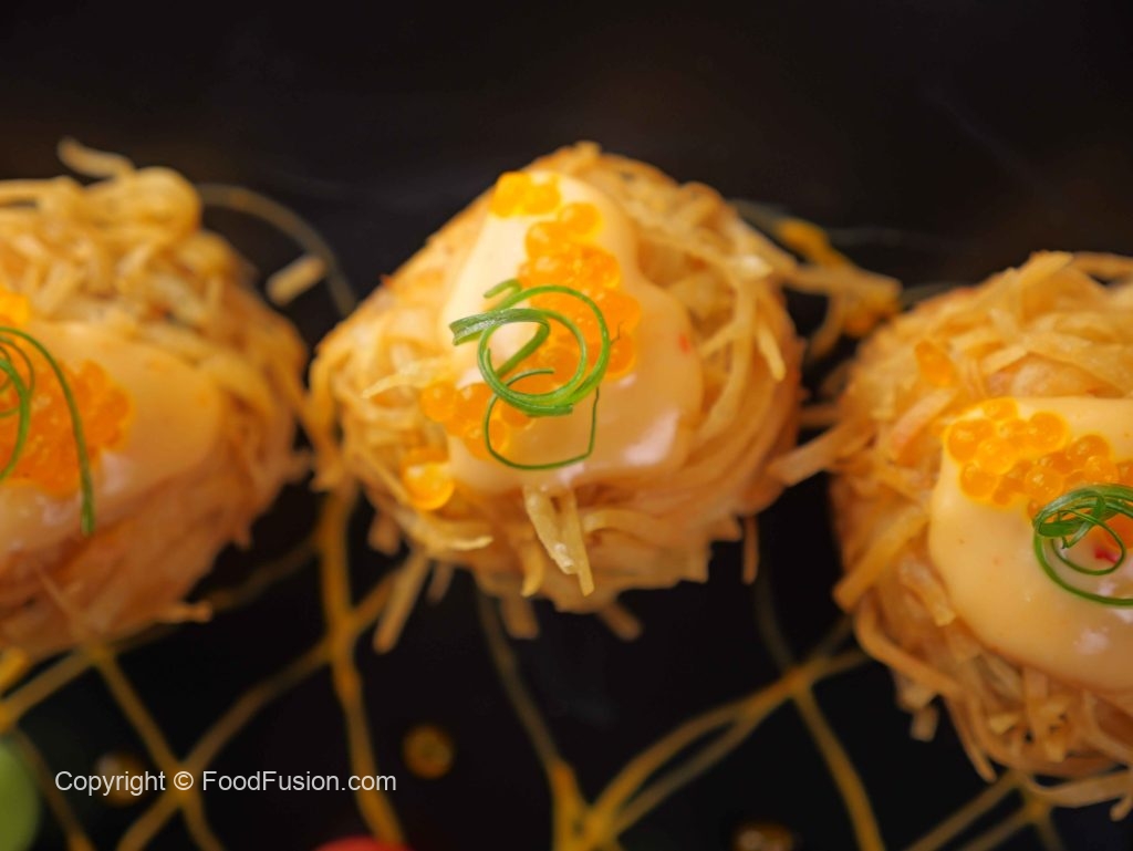 -Garnish karen bang bang sauce, caviar, green onion, cucumber aur cherry tomato ke saath.