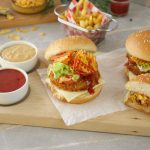 -On a burger bun,add & spread prepared fusion burger sauce,add cheddar cheese slice,fried crispy chicken patty,tomato slices,prepared fusion burger sauce,iceberg,chips,tomato ketchup & top with another burger bun.