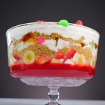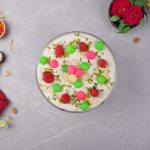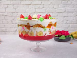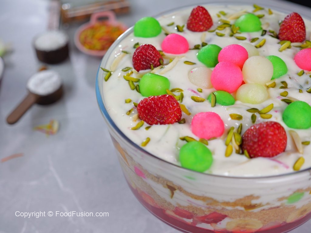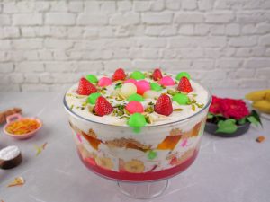 -Make another layer of mix fruits, biscuit crumbs, prepared custard, garnish with colourful sweets, almond, pistachios, strawberries & serve!