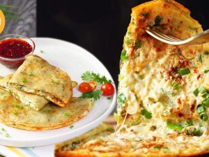 In bowl,add eggs,cheddar cheese,coriander and mozzarella cheese,mix well and set aside.