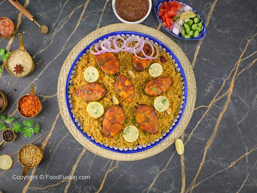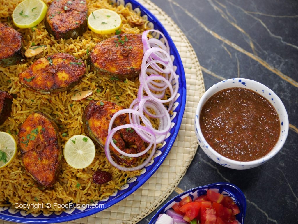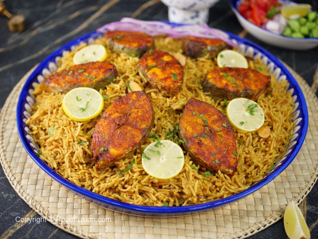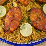 -Serving platter mein mandi rice dalein, upar baked fish rakh den.