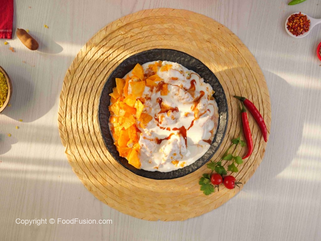 -In a bowl, add prepared dahi bhallay break them with spoon, sprinkle Dahi bada masala, papri, pour creamy meethi dahi, prepared imli chutney & serve!