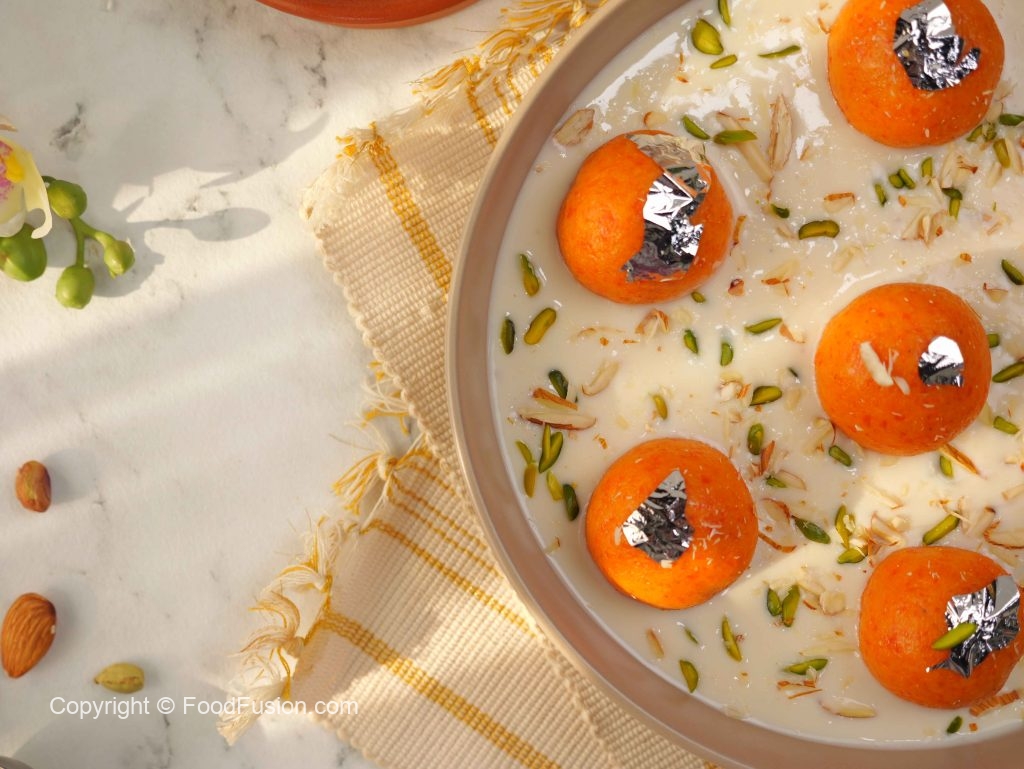 -In a serving dish, add prepared rabri doodh, prepared carrot jamun, garnish with edible silver leaf, pistachios, almonds & serve!