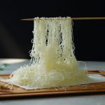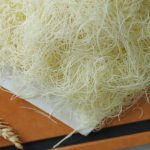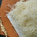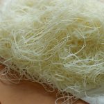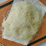 -After 5 to 10 seconds,it will begin to peel off of the pan.Once it does,gently pick it up with a wooden skewer & cover with a damp towel to prevent from drying out& continue this process until all the batter is used up (total yield: 250g).