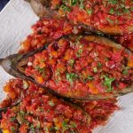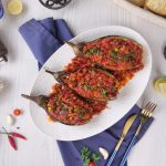 -Peel eggplants alternatively from the skin lengthways & prick with fork (don’t remove the head).