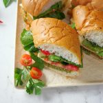 -Add & spread prepared pesto,mortadella slices,cheese slices,tomato slices,rocket leaves,olive oil,pink salt,black pepper powder & cover with top.
