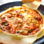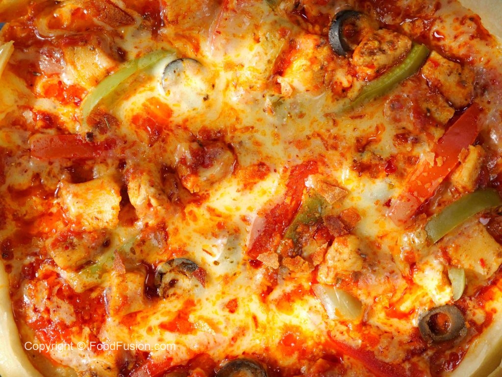 -Rolled dough ko baking paper par rakhain, cheddar aur mozzarella cheese, pizza sauce, cooked chicken, shimla mirch, tamatar, corn, olives, jalapenos, oregano aur crushed lal mirch dalein.