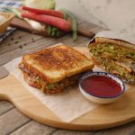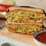 Vegetable & egg omelet per reserved vegetables,chicken salami dal ker toasted bread slice rakh dein phir flip ker ka bareek cheeni aur tomato ketchup dal dein aur top per remaining bread slice rakh dein.