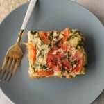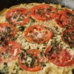 -Poke holes with the help of wooden skewers,place tomato slices,add & spread whisked eggs over it.