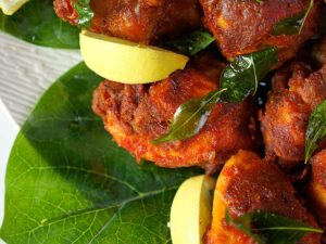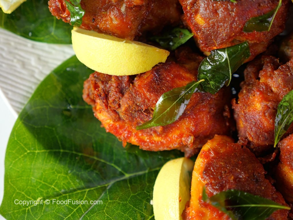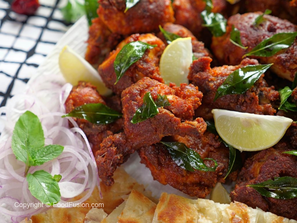 -Karahi mein cooking oil (140°C) garam karein aur marinated chicken ko halki ancch per golden & crispy