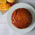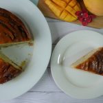 8 x 8 inch baking pan mein caramelized cheeni dal ker mango slices laga lein & side per rakh dein.