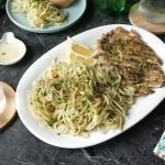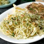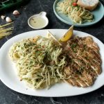 Sprinkle fresh parsley & red chilli crushed & serve spaghetti with grilled chicken & 7up.