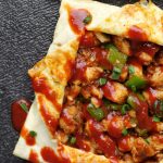 -Turn off the flame,add prepared chicken filling in the center & fold all four sides to make a square shape.