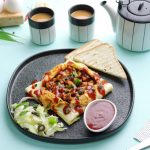 -Serving plale mein stuffed omelette rakh dein aur center sa plus shape mein cut ker ka open ker lein.