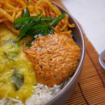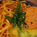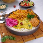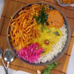 -Serving bowl mein rice, daal, crispy aloo, prepared teekhi chutney, pickle onion aur fried curry leaves dal kar serve karen.
