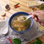 -Add lemon grass,ginger,onion,kaffir lime leaves,fresh coriander,pink salt,sugar,soy sauce,lemon juice,fish sauce,thai red chillies,chicken stock cube,cover partially & simmer cook on low flame for 25-30 minutes.