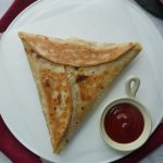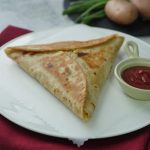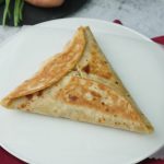 Add cheddar cheese and potato & chicken filling,fold & seal tortillas/roti to make a triangle (makes 6).