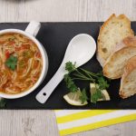 -Strain chicken stock,discard remaining residues & reserve stock for later use.