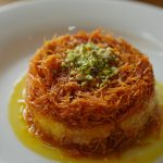 After baking,pour generously warm sugar syrup and garnish with pistachios.