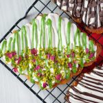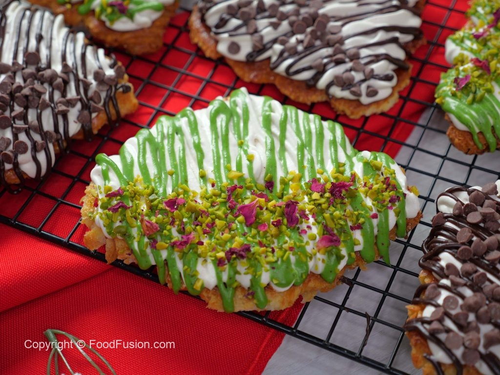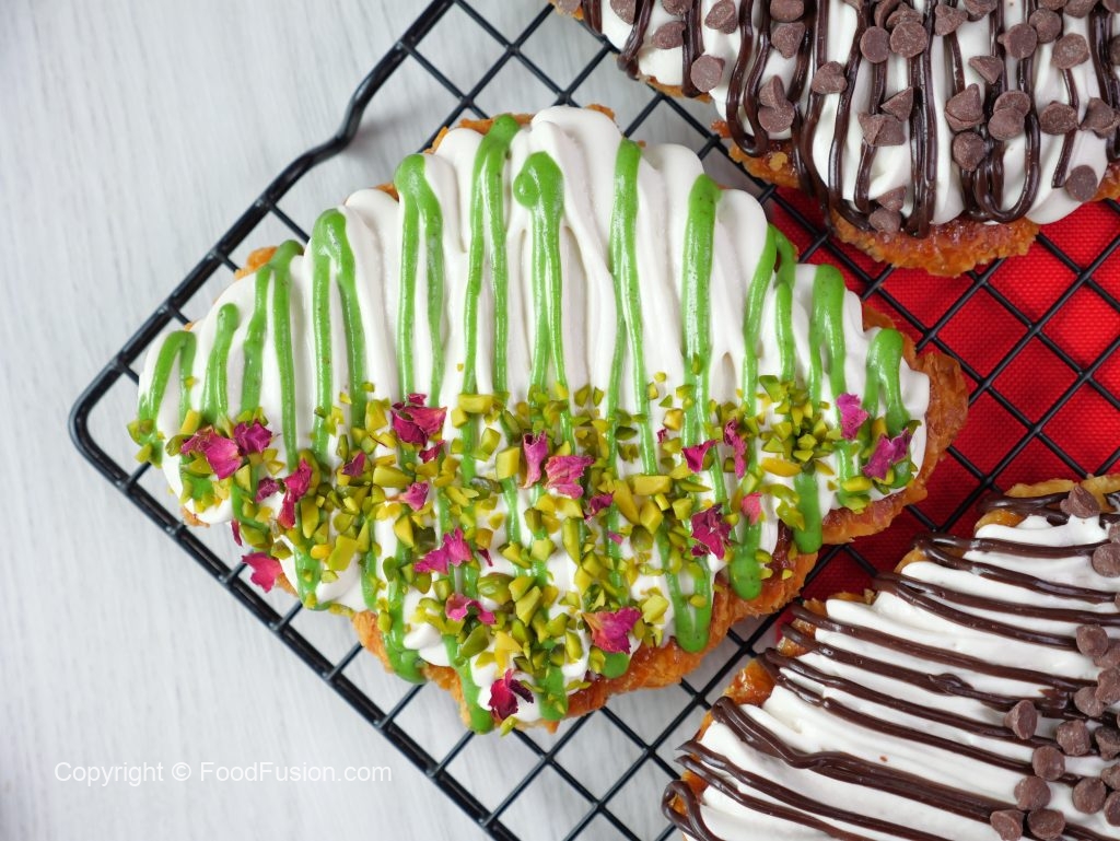 -Croissant par cream frosting spread karein,pistachio ganache lagayein,pista daalein aur dry rose petals se garnish karein (makes 6).