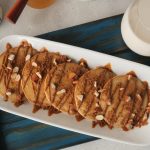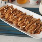 On serving plate,place lotus pancakes,drizzle lotus spread,sprinkle crushed caramel biscuit,almonds & serve!
