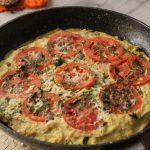 -Poke holes with the help of wooden skewers,place tomato slices,add & spread whisked eggs over it.