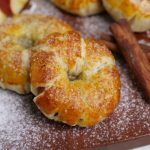 -Wrap each apple rings with puff pastry strips,poke the end of one strips in the hole,hold it with finger & wrap it around the apple ring & under (makes 4).