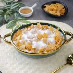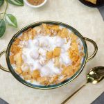 -In a serving dish,add soaked phulki,prepared meethi dahi,sprinkle chaat masala,garnish with papri & serve!