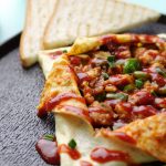 -Serving plale mein stuffed omelette rakh dein aur center sa plus shape mein cut ker ka open ker lein.