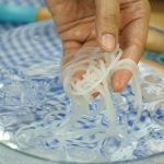 Corn flour mixture ko squeeze bottle/piping bag mein dal dein,bottle ko press ker ka hot corn flour mixture ko thanday pani mein squeeze ker lein aur noodles strands ko thanday pani mein bheega rehnay dein.