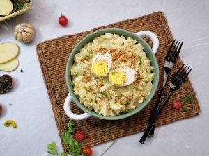 -Bowl mein grated aloo aur anday,mayonnaise,lal mirch crushed,lehsan powder,kali mirch powder,namak,soya,hara dhania aur lemon juice da ker ache tarhan mix ker lein & piping bag mein transfer ker ka side per rakh dein.