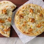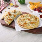 -Pita/shawarma bread per pizza sauce dal ker pheela lein,cooked chicken topping,shimla mirch,corn kernels,pyaz,cheddar cheese,mozzarella cheese & dried oregano dal dein.