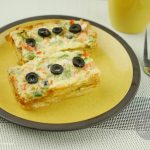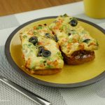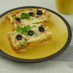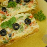 Mixture ko us tray me daliye aur us k upar se cheese k slices aur 3 se 4 katay hue olives rakh dijiye.