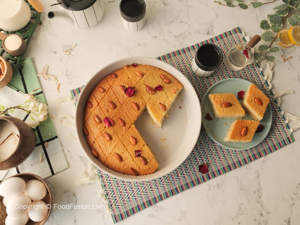 Prepare Basbousa cake with semolina & almonds: