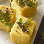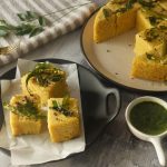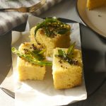 Now invert the dhokla on a plate and remove the pan.