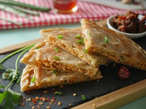 -Add prepared chicken filling (100g),place cheddar cheese slice,fold all sides & gently press to spread it.