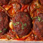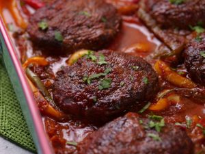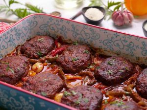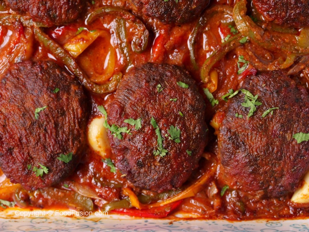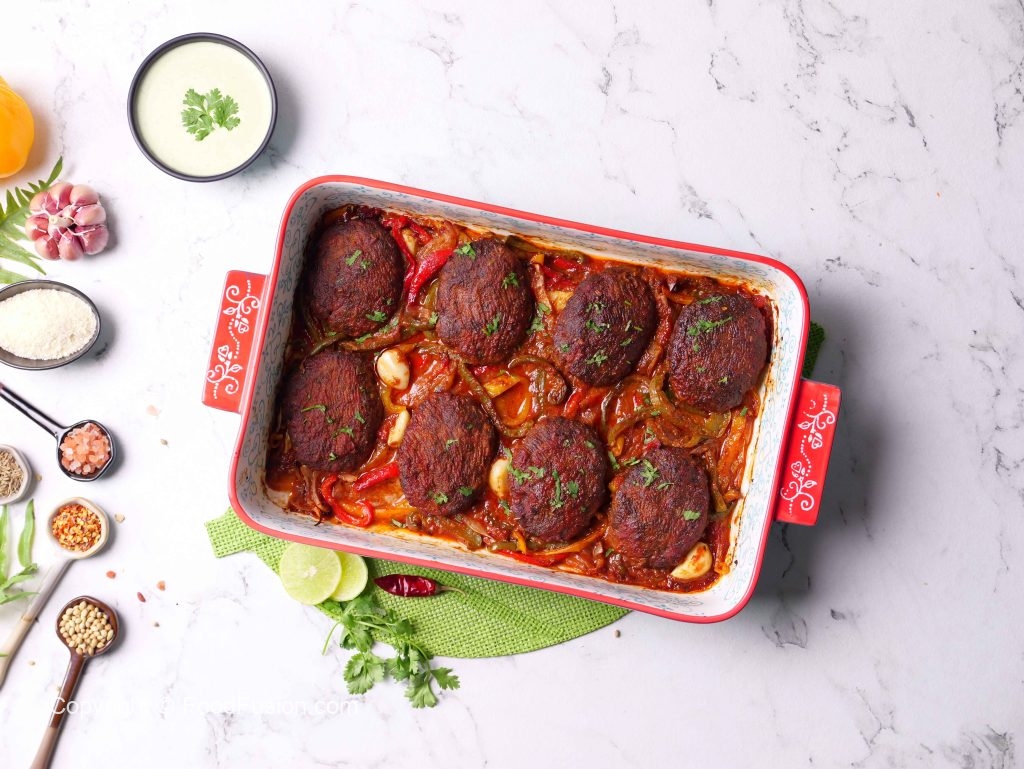 -Kebab baking dish mein rakh kar upar se tayyar sauce dal dein.