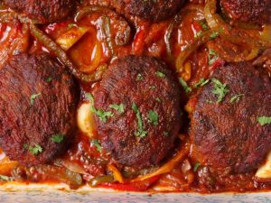 -Oven ko pehle se 180 °C par preheat karen, phir kababs ko 20–25 minutes tak bake karen, beech mein palat len aur kababs par sauce brush karen.