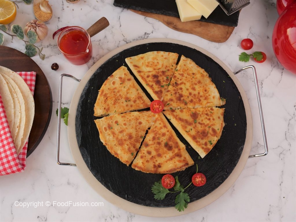 -Tortilla per tayyyar chicken & cheese filling ko ek side per dal ker pheela lein aur dosri side per flip ker lein (makes 5-6).