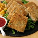 Cut into four pieces and coat potato side of bread slice with breadcrumbs (makes 8 bread slices).