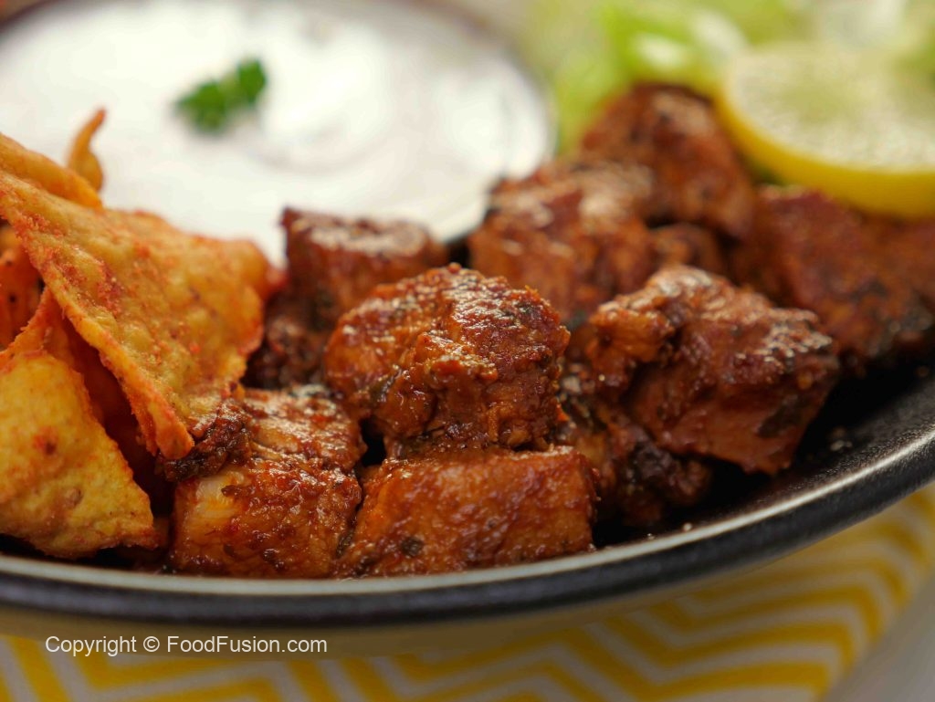 -In a bowl, add chicken, red chilli crushed, cumin powder, chicken powder, paprika powder, cayenne pepper powder, oregano, garlic, chipotle sauce, lemon juice, fresh parsley, olive oil & mix well.
