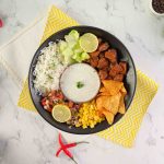 -In a serving dish, place a small bowl in the center, add yogurt sauce in the bowl, add prepared chipotle chicken, boiled rice, prepared tomato salsa, sweet corn, tortilla chips, ice-berg & serve!